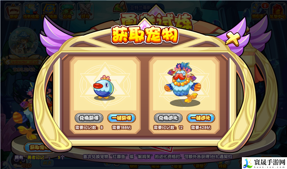 拿到足够的勇者印记就可以获取宠物啦!红唇鱼:8枚勇者印记、妮姆芙进化资格:12枚勇者印记。