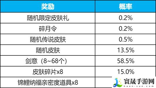 抽奖概率:随机限定皮肤礼:0.2%;碎月令:0.2%;随机传说皮肤:0.5%;随机皮肤:13.5%;剑意(8~68个):58.5%;皮肤碎片×8:15%;锦鲤纳福亲密度道具×8:12.1%