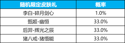 其中,随机限定皮肤礼、随机皮肤、剑意内的奖励概率分布见下图: