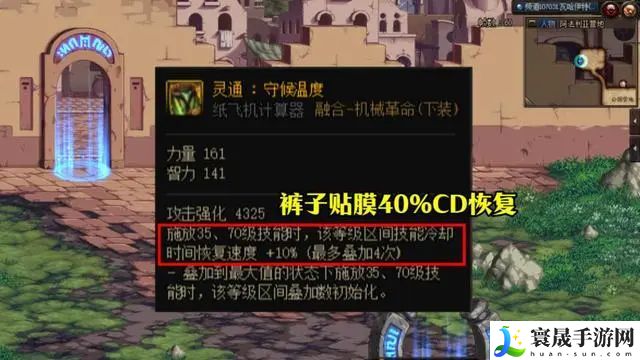 【3】超核心防具贴膜,裤子必选“灵通:释放35、70级技能时,CD恢复+10%,叠加4次”。