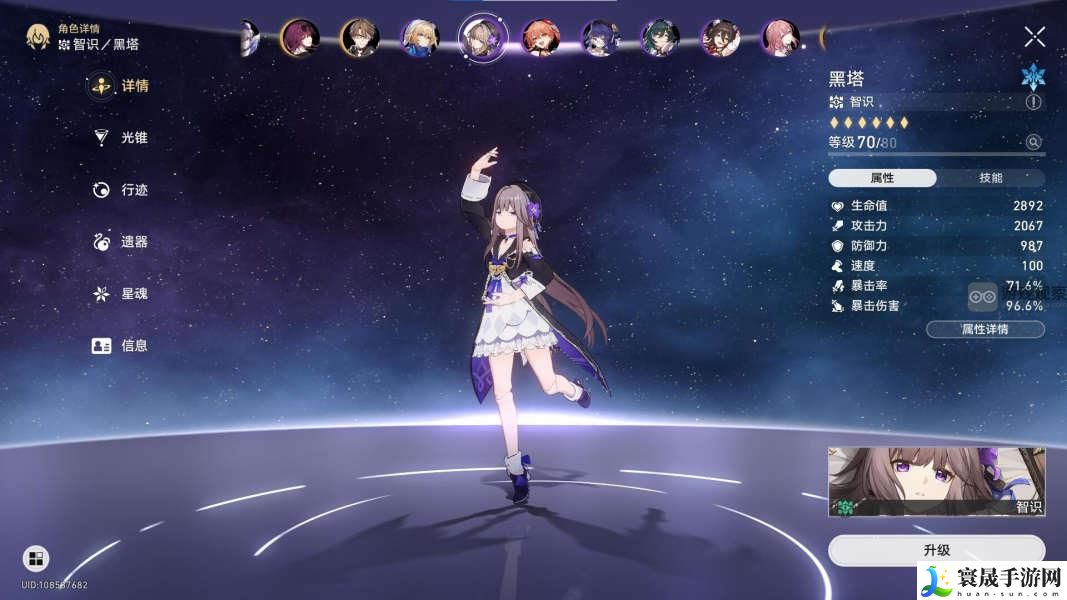 ③至于主C,在没有银枝的情况下,节点一我第一推荐的是黑塔。按照我的配置,黑塔可以全程打战技(注:我的阮梅是0+1,光锥会给一个点)。