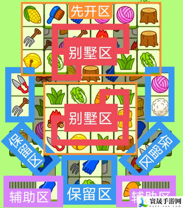 两个L字形大别墅,两个斜着的长形大别墅。开局先消除橙**。然后按照一层层均匀消除表面牌。哪里压牌比较多就先消除哪里。必要时可以用盲盒区辅助消除表面牌。尽量还是以别墅区互相消除为生。蓝**有叠牌,但是不多,全部保留到后期使用。