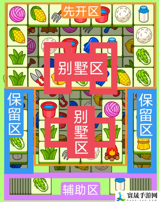一个工字型大别墅,一个方十字形大别墅。开局先消除橙**。然后按照一层层均匀消除表面牌。哪里压牌比较多就先消除哪里。必要时可以用盲盒区辅助消除表面牌。尽量还是以别墅区互相消除为生。蓝**有叠牌,但是不多,全部保留到后期使用。