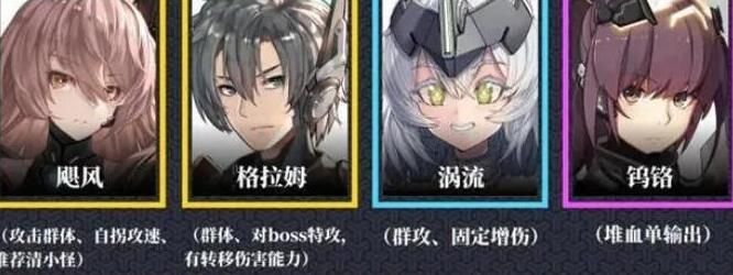 飓风(群攻)、格拉姆(群攻 伤害转移)、涡流(群攻增伤)、钨铬(单体输出)等角色。