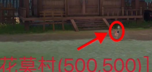2、王大**门右转,直走看见茅草屋门口,花莫村500,500处,找到第二只鸡。