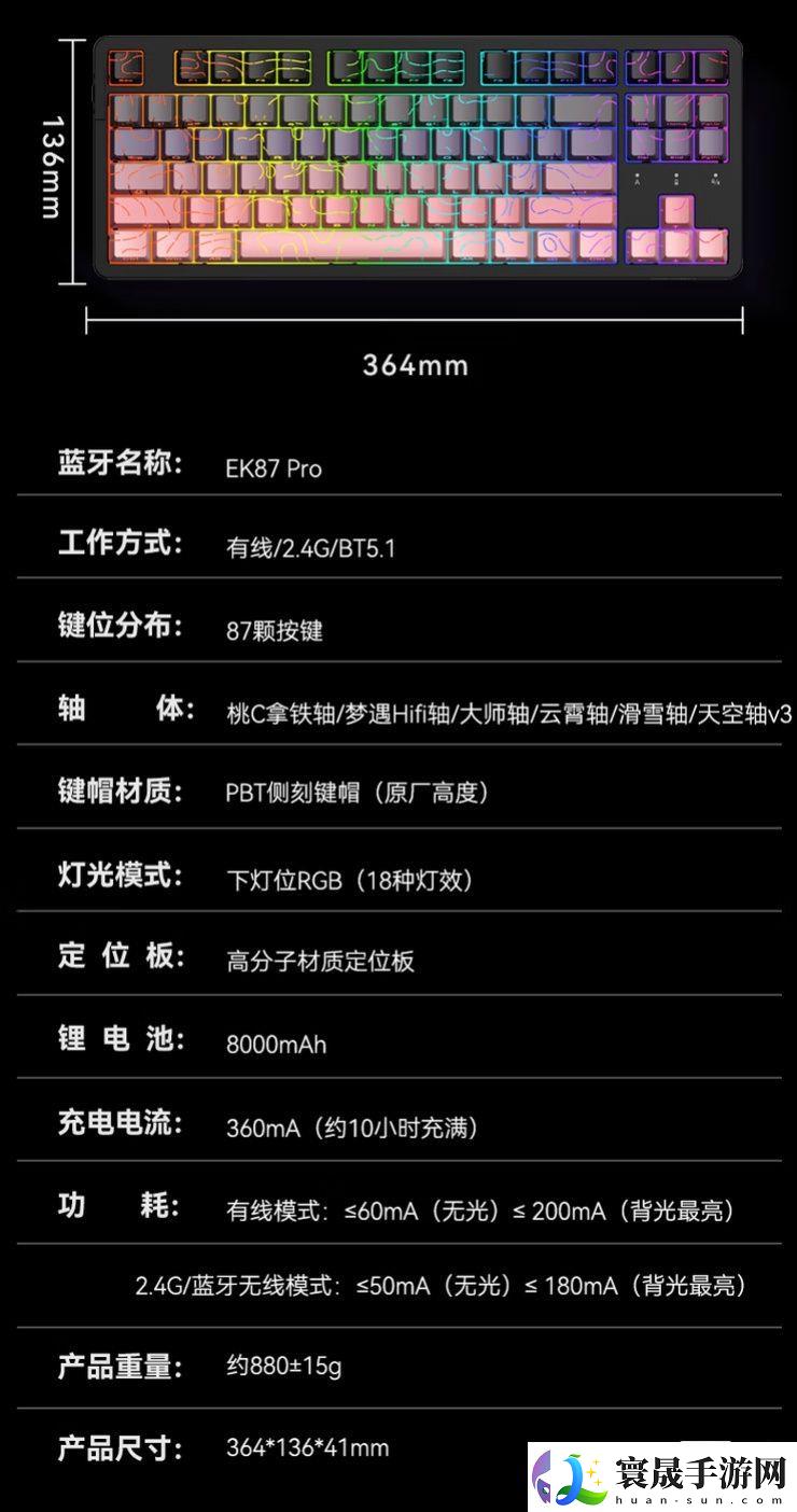 该键盘使用87键布局,内置8000mAh 锂电池,配备“高分子材质定位版”,拥有下灯位RGB灯,支持2.4G / USB /有线三模连接。