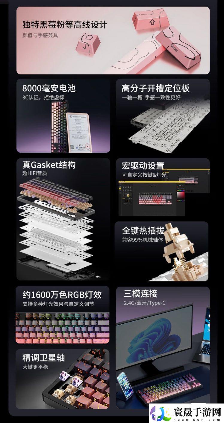 该键盘使用 Gasket结构多层填充内胆,目前上市这一“黑莓粉渐变等高线”版本号称进行填充升级“手感更软弹,杜绝空腔音”,键盘搭载“桃 C 拿铁轴”,配备PBT粉紫色键帽,支持全键热插拔、全键无冲。