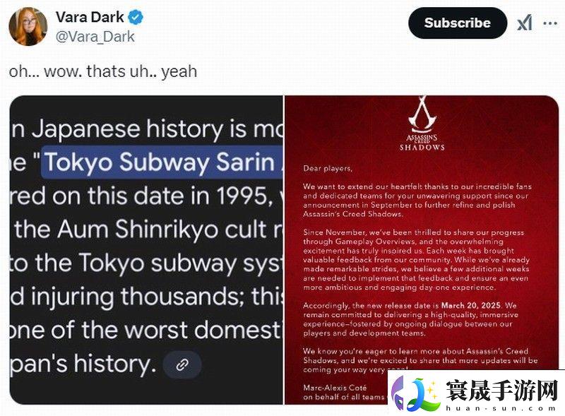 记者Vara_Dark发推文称,30年前即1995年3月20日,在日本国内发生了一起严重的恐怖袭击事件——东京地铁沙林毒气事件,而刺客信条:影也在同一天发售,这就有点无语了。