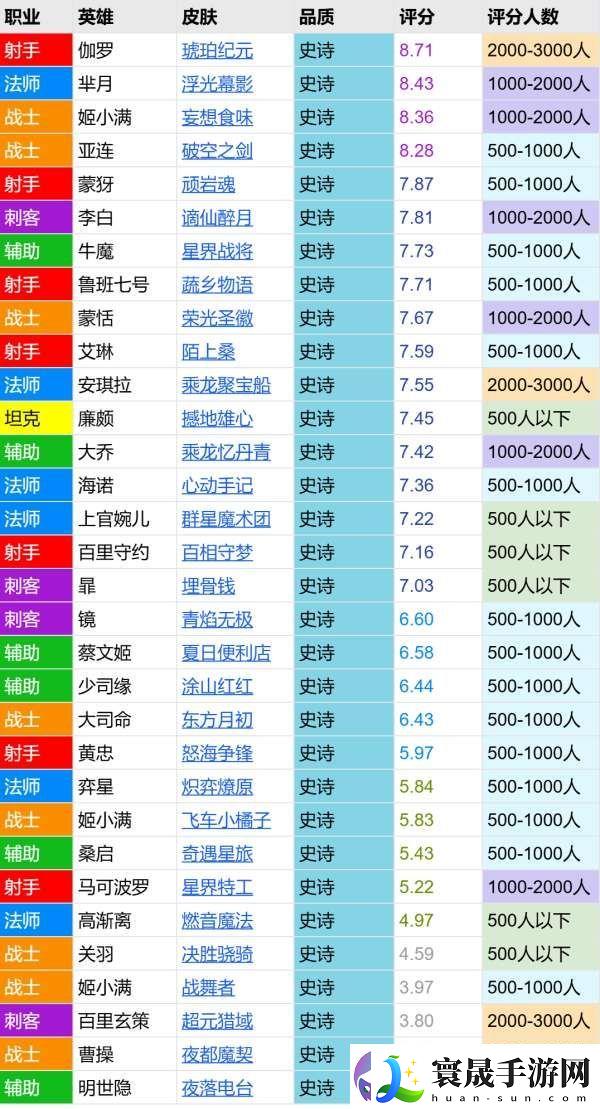 24年至今共上架评分32款史诗皮肤,总体质量较差,平均分仅有6.55分。飞车小橘子的分数和弈星KPL皮极为接近,排在倒数第九位。