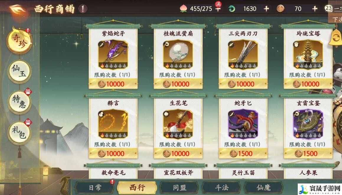 西行商铺可兑换角色【专属法宝】和【法宝材料】。每周法宝材料【觅宝钱】和【法宝源蕴】可优先兑换完。橙色法宝和紫色法宝需结合自身阵容兑换,按自身需求进行即可,无明确优先兑换哪个之说,如阵容有托塔天王,需玲珑宝塔可优先兑换【玲珑宝塔】,需输出法宝可优先兑换【三尖两刃】,前期橙色法宝较难兑换,可先兑换紫色法宝过渡。