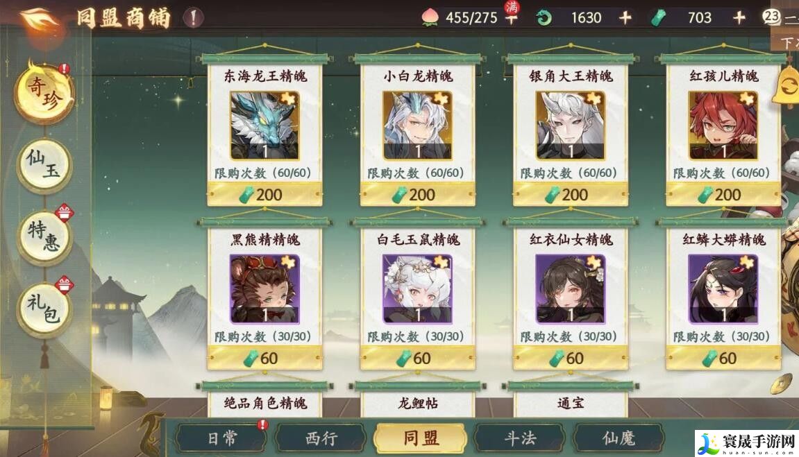 同盟商店每月刷新一次,商店福利不错,可兑换橙色角色。优先考虑兑换橙色角色,目前内测共有 4个橙色角色:东海龙王、小白龙、银角大王、红孩儿,最值得兑换的是龙王和银角,狮子推荐优先兑换龙王,这是毕业级坦克且实用性高,银角也不错。小白龙和红孩儿强度中规中矩。其次可考虑兑换厉害的紫色角色:黑熊精和白毛玉鼠,这两个对平民玩家来说可用到后期。最后兑换每周的【龙鲤帖】。【绝品角色精魄】和【通宝】不推荐兑换