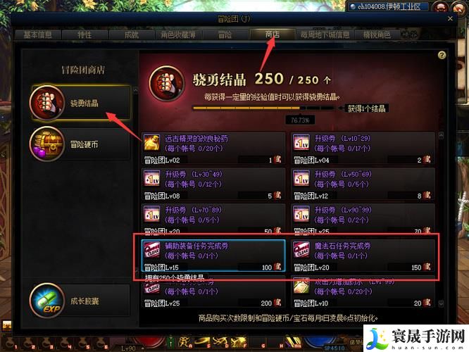 ps:可在冒险团商店中使用骁勇水晶直接购买左右槽任务完成券,使用后也可以直接开启左右槽(需要达到指定等级才能使用,辅助装备:60级;魔法石:65级)