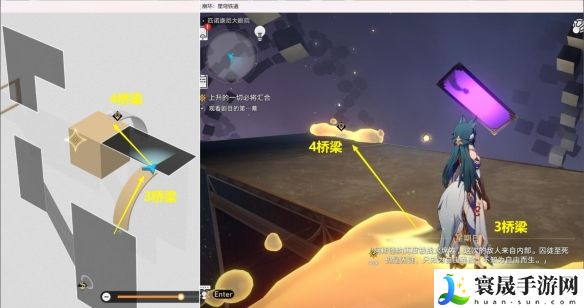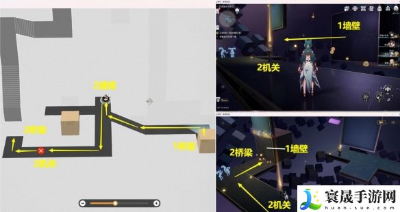 5、从【1桥梁】上来后,接着去【2酒塔】获得次数,接着启动【2机关】将【1墙壁】移动到左边,然后从【2桥梁】上去。
