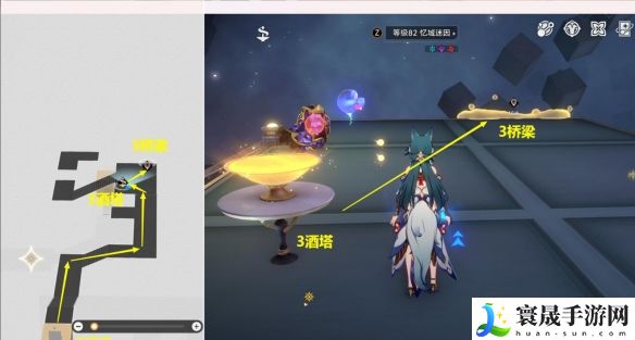 6、从【2桥梁】上来后,接着去【3酒塔】获得次数,然后从【3桥梁】下去。