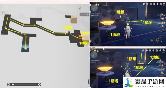 4、进入上图第1个镜子副本后,去【1酒塔】获得次数,接着启动【1机关】将【1地板】移动到右边,然后从【1桥梁】上去。