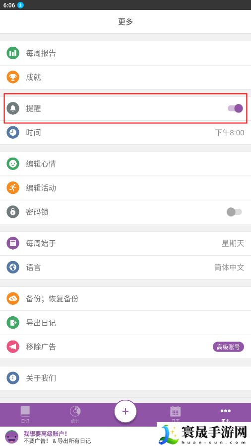 7、最后来到“更多”设置页面,打开“提醒”,这样就不会忘记写日记啦;