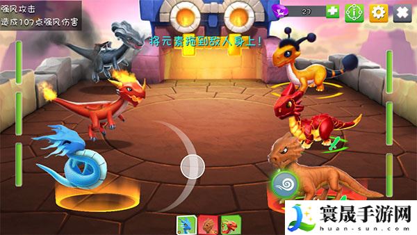 3、战斗期间,把元素滑到龙身上不要立即放开,可以查看对敌方龙伤害的红色血条,合理选择元素用在合理的龙身上,可以减少自己龙受到的伤害。