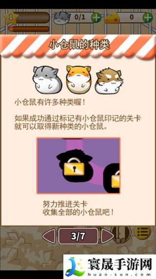 3、其中小仓鼠种类比较多。如果成功通过标记有小仓鼠印记的关卡就可以取得新种类的小仓鼠,努力推进关卡,收集全部的小仓鼠吧!