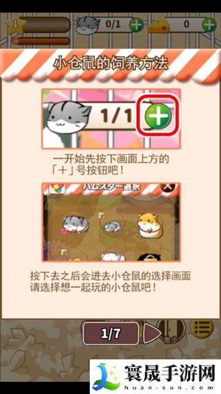 1、饲养方法,首先按下画面上方的“+”号按钮,然后按下去之后会进去小仓鼠的选择画面,请选择想一起玩的小仓鼠吧!
