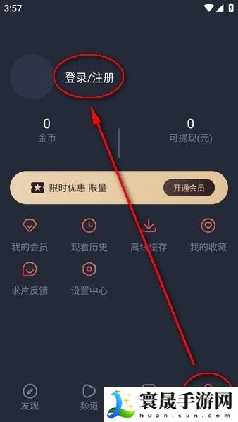 打开次元喵动漫网页版在线观看免费版后,进入右下角“我的”,看到左上角“登录/注册”,点击。