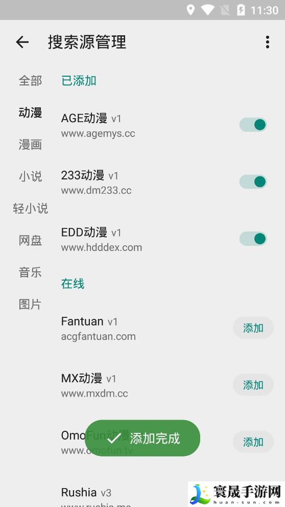 2、在这里大家就会看到软件中内置了非常多的资源站,包含了漫画、小说、动漫、音乐、网盘搜索、轻小说等等,大家需要做的就是点击后面的添加按钮即可,添加的资源站越多软件中的资源就越丰富哦!