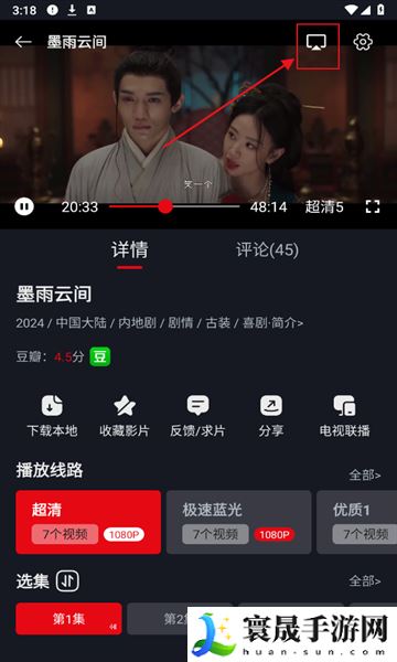 2、挑选自己想要观看的剧集,在右上角打开投屏,等待搜索设备。
