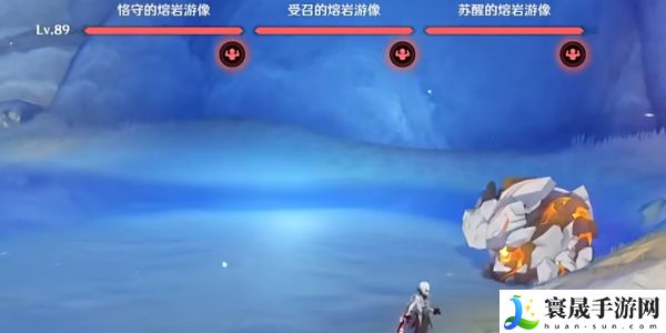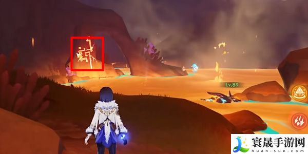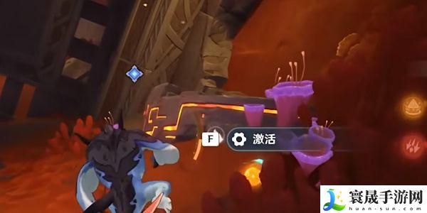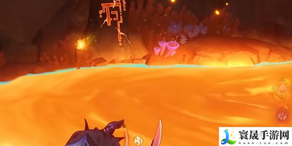 4、然后穿过铁门调查熔浆池中的装置,变身为鳍游龙寻找2处揭露文,返回熔浆池中的装置旁