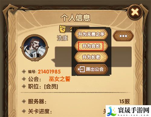 3、选择你想转让会长的成员,进入个人页面,点击名字后面的省略号,再点击【升为会长】,自己成为普通会员即可退出公会。