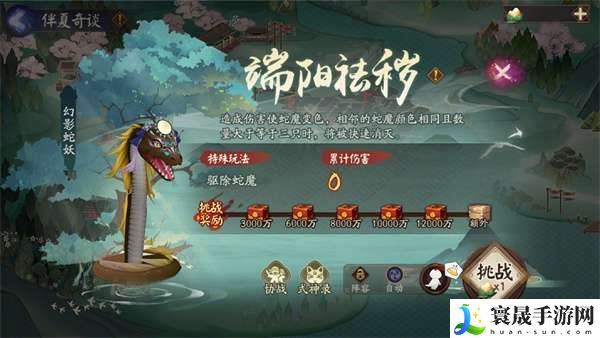 3、在「 端阳祛秽」中,大人可以消耗「合战粽」开启战斗,战斗结束后可获取累计伤害与结算掉落奖励。