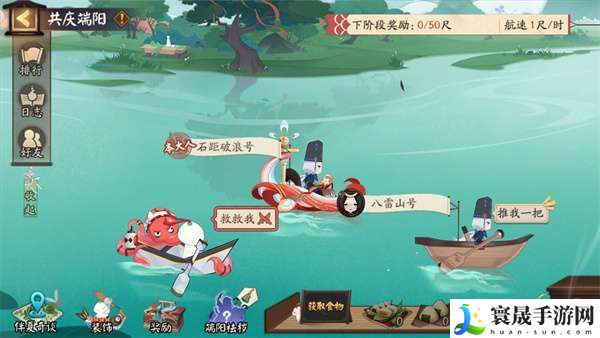 3、在航行中通过其他玩家的助推,给角色喂食食物让小船航行的更远。