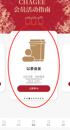 4、在活动页面滑动卡片,找到【以茶会友】并点击进入。