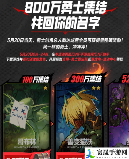 5、5月20日当天,勇士创角总人数分别达成100W、300W、520W、800W后,全员可瓜分里程碑奖励!更有部分幸运勇士可获得惊喜掉落大奖。