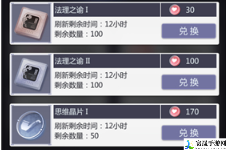 1、打开兑换所,可在这里使用友谊徽章,兑换各种卡牌所需培养材料。如进化思绪晶片,强化思绪法理之谕等。
