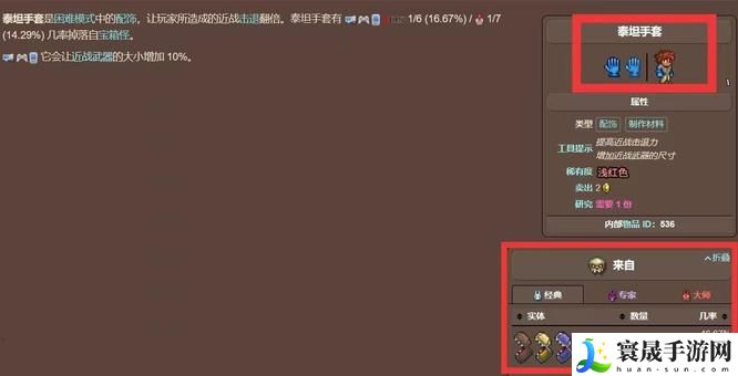 泰坦手套获取方法:无法制作,可来到地下深处位置,找到各种颜色的宝箱怪,有14.29%概率获得泰坦手套。