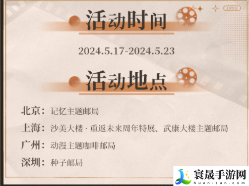 活动期间,拍摄带有1999元素的邮局照片/视频,带话题#重返未来1周年箱中展映#公开发布于任一社交媒体平台,在打卡区出示分享页面及游戏UID页面,即可获得周年纪念明信片一张。