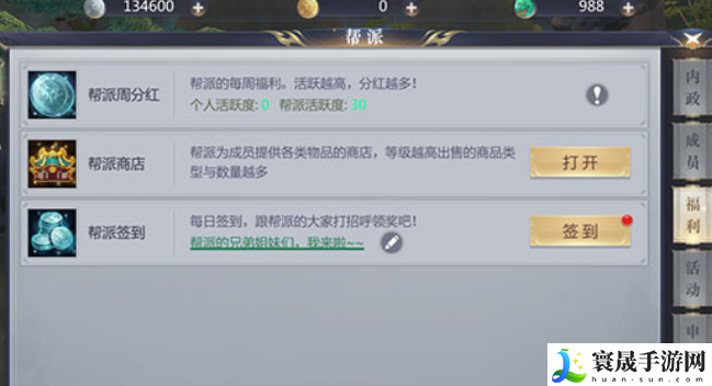 3、大家也可以选择加入帮派,每日签到、完成帮派任务等,都可以获得银币奖励。