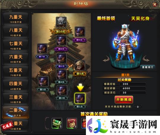 封神塔一共分为九个级别选择等级对应的层数进入,每重天首次通过将会获得一次而外奖励,上次挑战失败的关卡,可以消耗挑战次数继续挑战。已通关并且与当前等级不符的重天将不能再重复进入,每日都可以获得3次挑战次数,并且有丰厚的排名奖励。