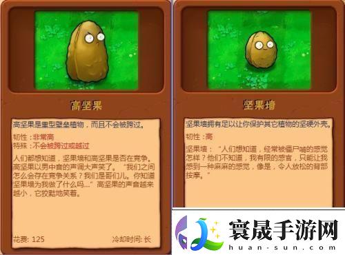 第三种:坚果墙。耐久:4000,价格:50阳光,冷却时间:30秒,可栽种于草地、花盆和睡莲上,特性:以高耐久阻挡僵尸前行。坚果墙有两种,一种高的,另外一种就是普通的,在游戏中我们一般选择的都是普通的,因为高的虽然耐久性比较强,但是花费是比较高的,除非是在比较富裕或者超级僵尸来临的时候。
