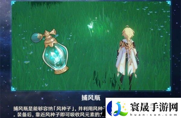 捕风瓶是能够容纳【风种子】,并利用风种子的能力产生风场的实用道具。装备后,靠近风种子即可吸收风元素的力量,获得可使用次数。