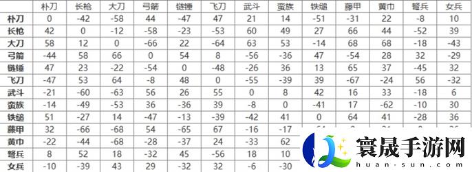在第一列找到敌方兵种,在本行查找负数即为我方可知敌人,负数绝对值越大克制越强。