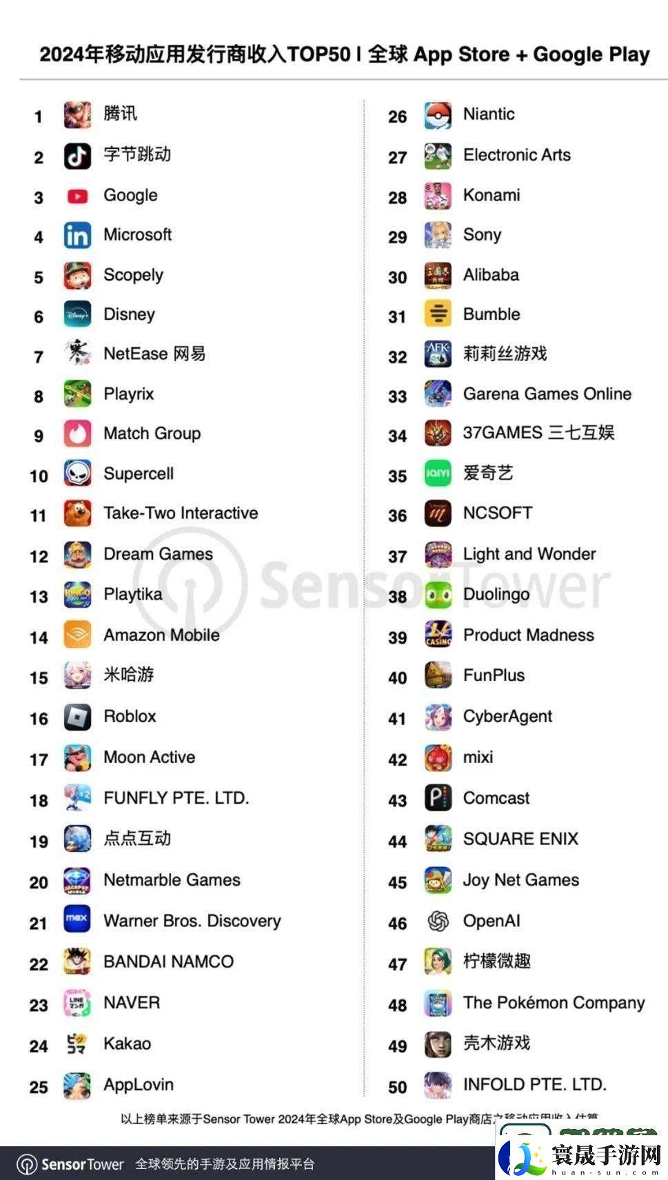 在榜单的顶尖位置,腾讯以其全面的生态布局,特别是在游戏和社交领域的深厚积累,再次稳居榜首。紧随其后的是字节跳动,凭借其TikTok生态的全球化战略,收入实现了38.2%的激增,稳坐第二把交椅。谷歌和微软依然稳固地占据第三和第四的位置,而Scopely则以惊人的57.1%增长率脱颖而出,成为本年度最大的黑马,位列。